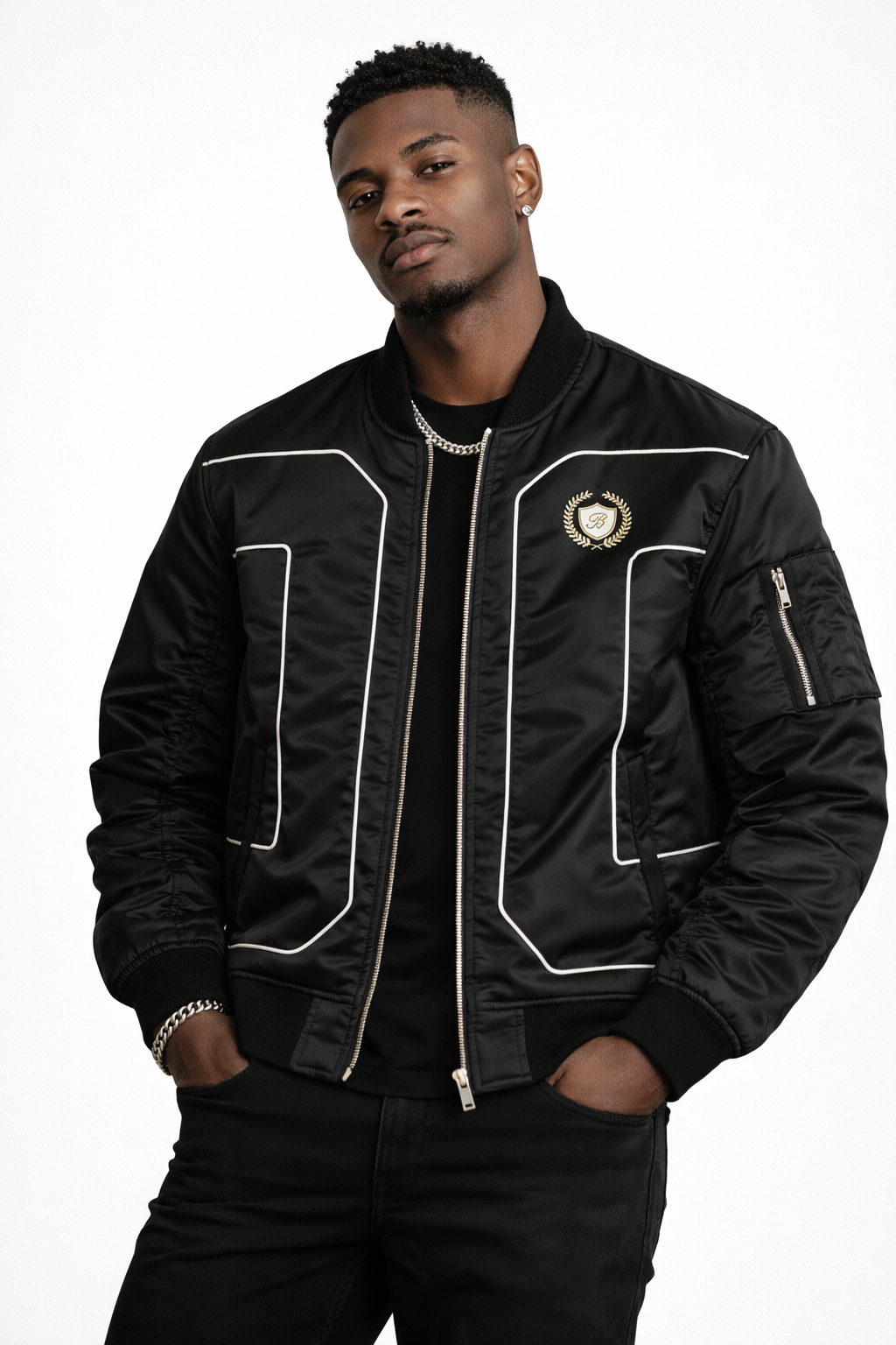 Elevate your outerwear with the Ivo Oversized Nylon Bomber Jacket in timeless black. Designed with a relaxed, oversized silhouette, this statement piece features crisp white piping for a sharp contrast and a mirrored statement badge on the chest for a bold, modern edge. Finished with detailed embroidery on the back panel, the Ivo bomber is the perfect balance of comfort, versatility, and standout style — an essential addition to every wardrobe.