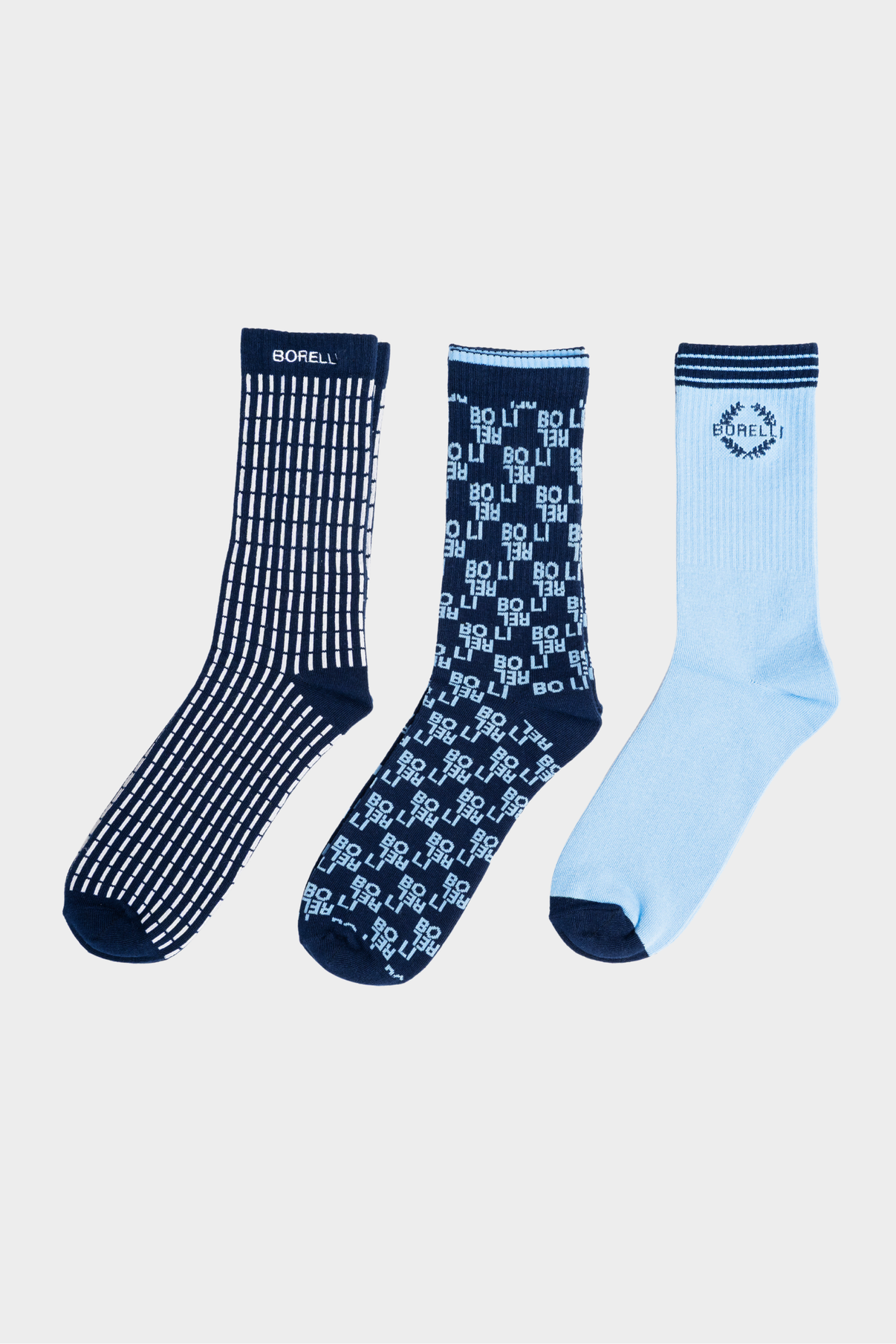 Featuring a ribbed shaft design for a secure fit and finished with refined embroidered detailing, this pack includes timeless navy, classic white, and versatile sky blue – perfect for finishing off any look with understated confidence.